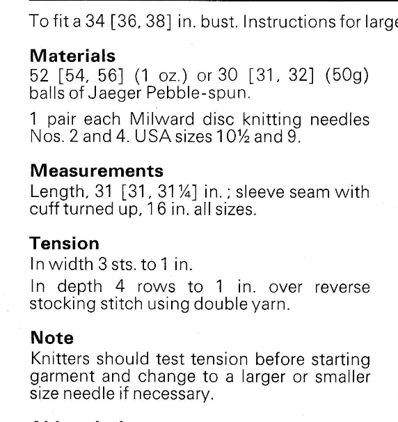 Much older patterns (usually 1970s and earlier) are written in UK imperial terms. For help with this, please click here to read our vintage pattern help and knitting needle size conversion chart.