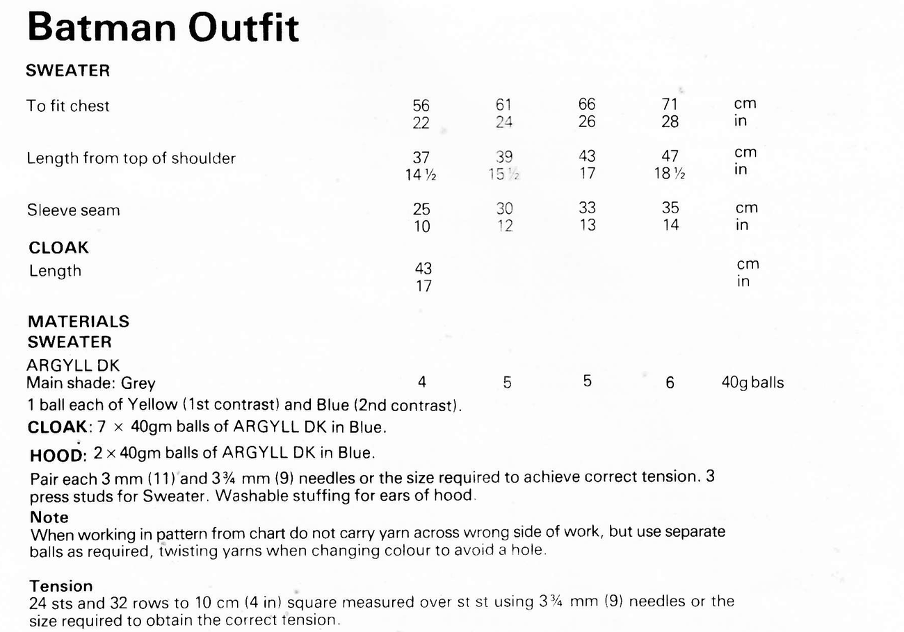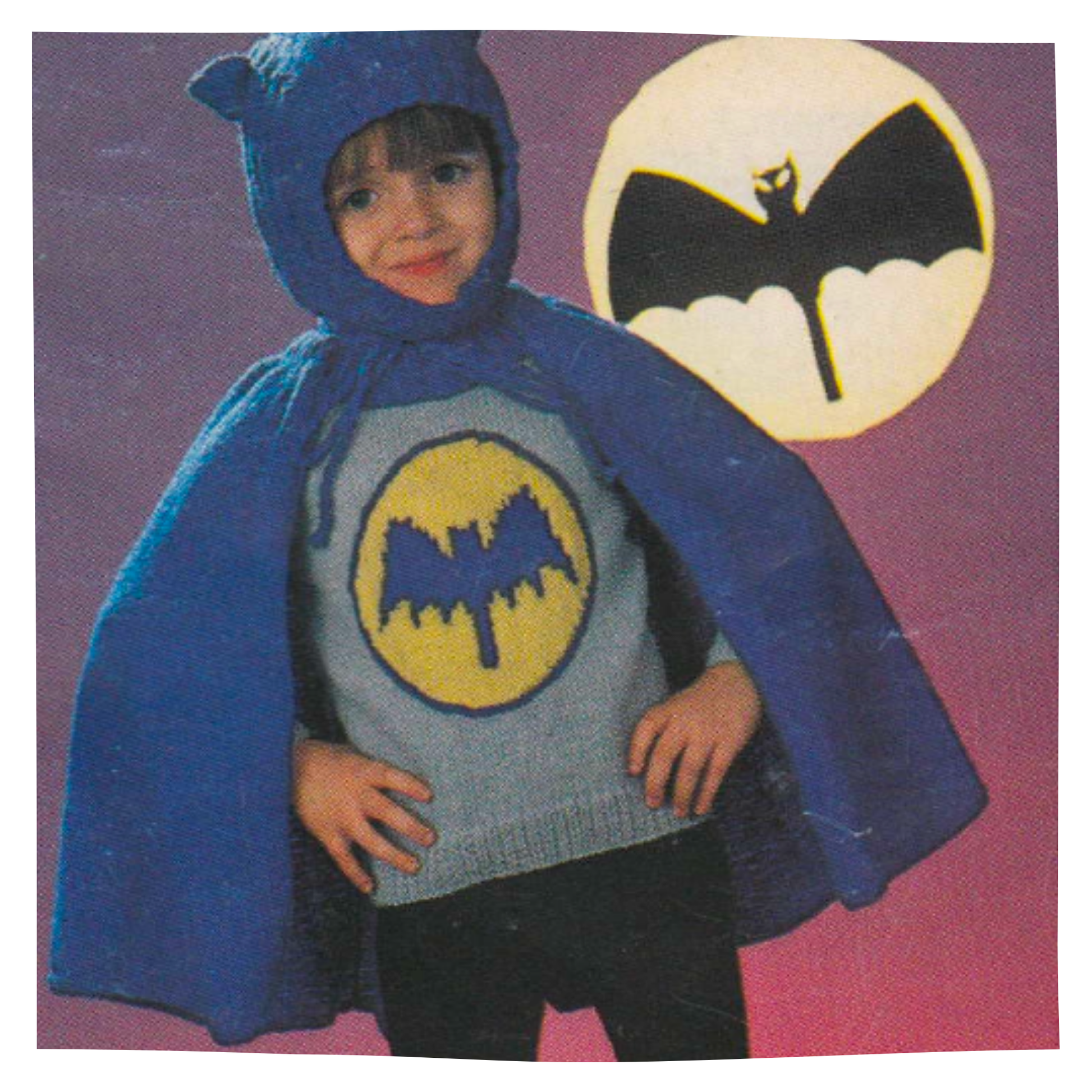 An instant download vintage knitting pattern for Batman and cape sweater set in size children 22 to 28 inch chest.